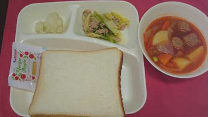 今日の食パンにはりんごジャムがつきました。サラダのドレッシングには生レモンの果汁を使用しています。