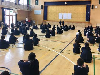 講堂にて、4年生・5年生全員で百人一首大会をしています。