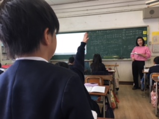 算数科の学習の様子です。スクリーンに映し出された線分図を見ながら、問題を解いています。