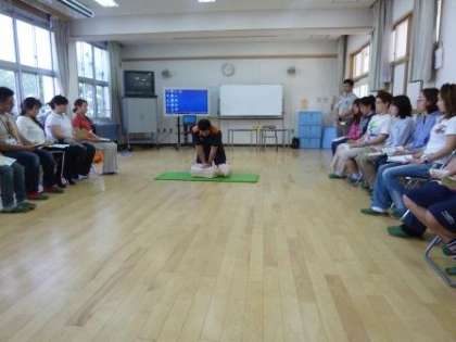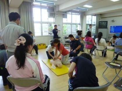 生野消防署の方に来ていただき、PTAと教職員と合同で救急救命講習会が開催されました。