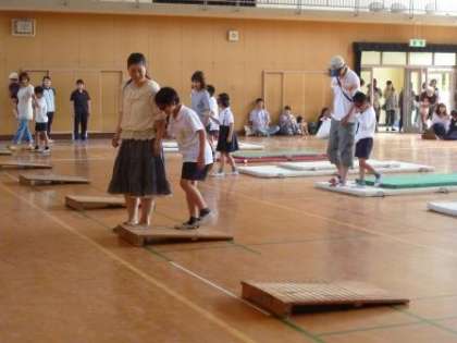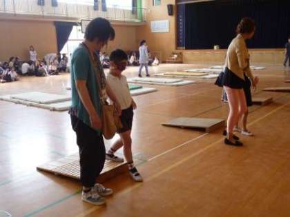 3年生は、アイマスク体験をしました。おうちの方の腕をしっかり持って歩きます。