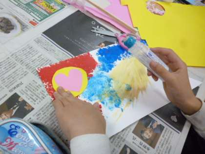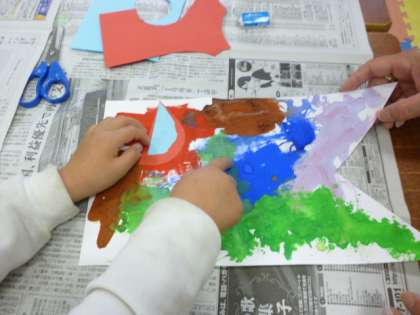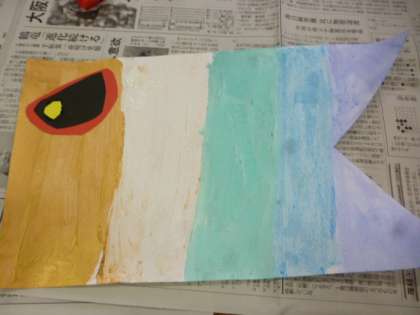 先週に引き続き5月の掲示をつくりました。目玉を切って貼り、うろこの模様をつけ足して、立派なこいのぼりが完成しました。最後は、それぞれ工夫したところを発表しあいました。