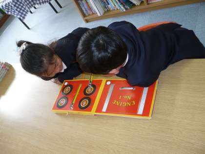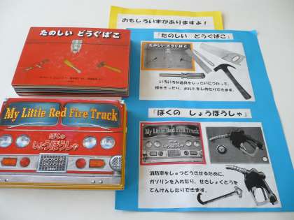 どちらの本もページの中に仕込んである道具(もちろん紙でできています)を実際に使って、板を切ったりねじを回したり、給油・点検をして消防車を発車させたりできます。子どもたちは休み時間になると、図書館で作業を楽しんでいます。