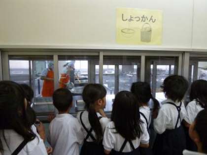 1年生が、給食室の見学をしました。大きなしゃもじやなべ、ざるを見て驚いていました。