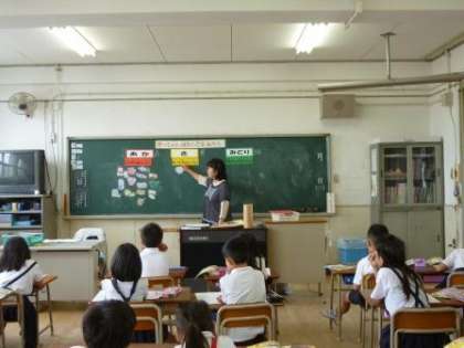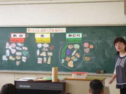 2年生の栄養指導の様子です。「じょうぶな体をつくろう」という主題で、赤、黄、緑の3つの栄養素の働きについて、栄養教諭の先生に教えていただきました。