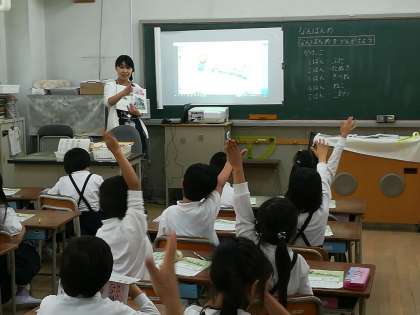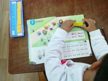 「なんばんめ」の単元を学習しています。大型モニターに映されたデジタル教科書では、かけっこする動物たちが動くので、子ども達も興味津々。どの動物が一着かもすぐにわかります。その後は、自分の教科書にブロックを置いてみて、確認していました。