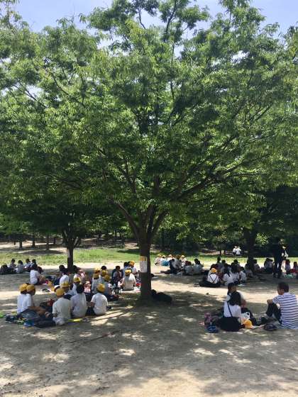 木陰で楽しくお弁当を食べています。