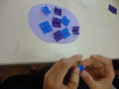 今日は6月の掲示「あじさい」を制作しました。小さな折り紙であじさいをたくさんおりました。花びらのように見える部分は、実は「ガク」なんだそうです!