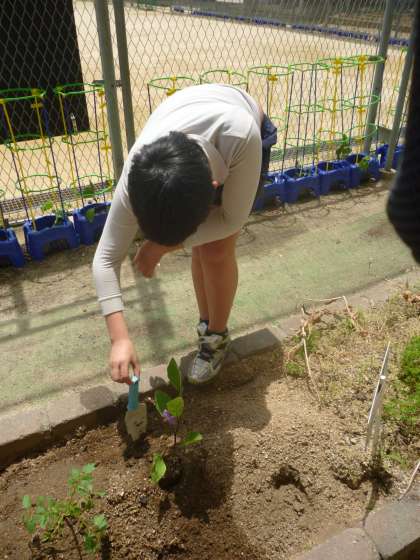 野菜の苗も植えました。ミニトマトとなすとピーマンを植えました。大きくなるのが楽しみです。