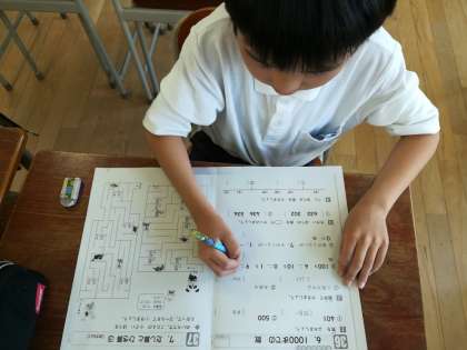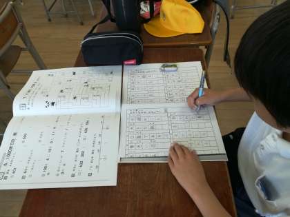 5月14日(月)の様子です。宿題が早く終わってまだ何か勉強したい子には、プリントを用意しています。計算をしながら進む迷路など、ちょっとしたお楽しみのある教材にしています。そのせいか、やりたい!との自発的な声がたくさん出ていました。