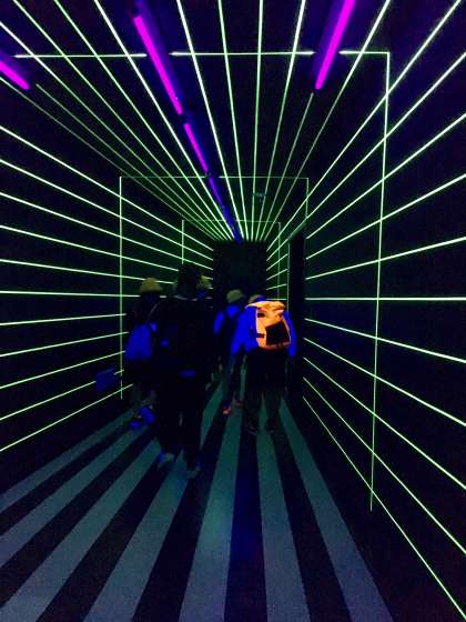 パースペクティブ(透視図法)で描かれた長い通路やブラックライトでイラストが浮かび上がるマジカルグラフィックスなど、人間の脳力エネルギーを惑わす「錯視・錯覚」の体験。