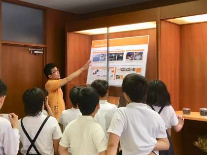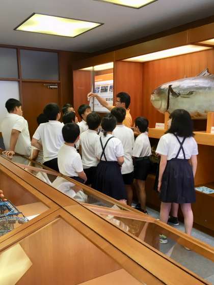 展示室にて、近大マグロの剥製を見ながら開発についての話を聞いています。