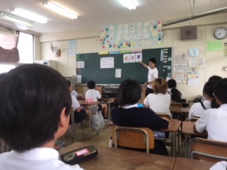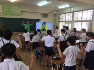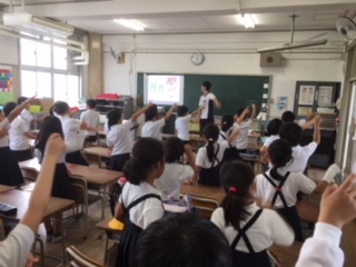 金曜日の朝は、イングリッシュタイムで始まります。プロジェクターや大型モニター、絵カード等を活用し、音楽に合わせてリズムをとりながら英語に親しんでいます。