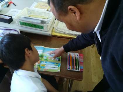 3年生がバイラ先生との初めての学習でした。「I like blue」という単元で、英語での色の言い方を学びました。いろんな色の英単語を学んだ後は、教科書の中のまっさらな虹を自分色の虹に塗りました。それぞれにきれいなMy rainbow に仕上がっていました。