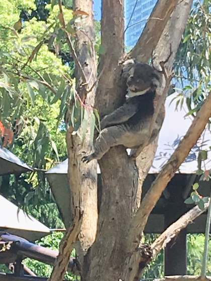 ユーカリの樹にいるコアラを見ています。