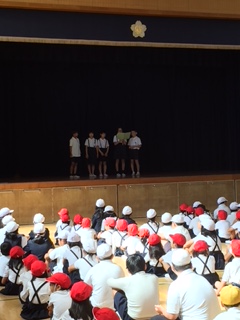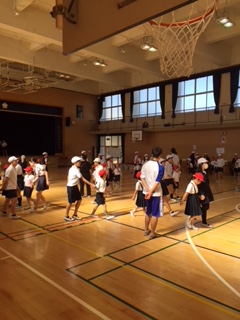 今日は、体育館で1年生・6年生の児童集会がありました。今日のゲームは、三択クイズです。クイズの内容は、担任の先生の好きな食べ物や好きな色などいろいろです。1年生と6年生が、手をつなぎながら話し合い、楽しそう活動していました。