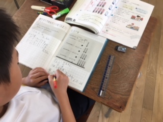 3年生の習熟度別少人数授業です。わり算の学習をしています。見通しをもって、筋道を立てて考え、問題解決に取り組んでいます。
