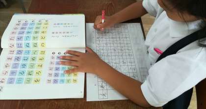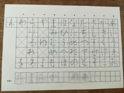 1年生は、ひらがなのテストをしました。何も見ずに五十音すべて書くことができます。テストの後は、教科書を見ながらお直しをします。ひとマスを4つに分け、どこのお部屋から始まっているかなど視覚的にとらえ、バランスよく書くことに気を付けています。きれいな文字は財産です。一年生のうちに身に着けるといいですね。
