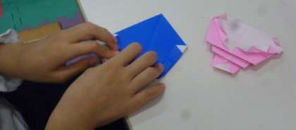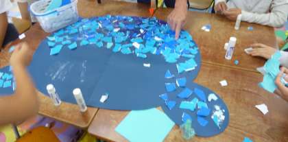 今日のあゆみの時間は、大忙し!再来週の親子交流会の招待状作りと、7月のあゆみ前掲示と玄関掲示の制作をしました。7月の掲示はあさがおです。青や水色、ピンクの折り紙で折ってつくりました。玄関掲示には、みんなで折り紙をちぎって、貼り絵のくじらをつくりました。