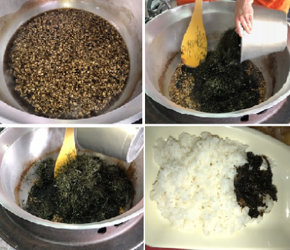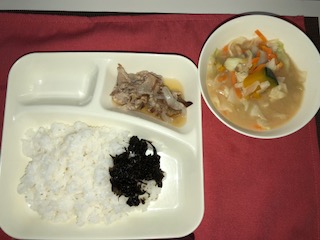 のりのつくだ煮は学校での手作りで砂糖・料理酒・みりん・こい口しょうゆ・だし・しいたけ(しいたけのもどし汁も含む)を合わせて煮あげ、かつおぶし・きざみのりを加えさらに煮つめて出来上がりです。ごはんがすすむ1品です。