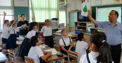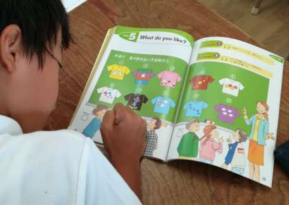 ‘What do you like?’の単元を学習しています。色と形の英単語のおさらいをゲーム形式でしました。教科書に載っているTシャツの中で、どれが好きなのかヒントをあげて、当てっこし合いました。遊びながら自然とボキャブラリーも増えていきます。