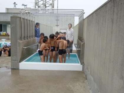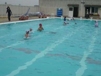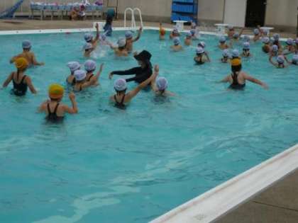 2年生の様子です。合図に合わせて、水の中で手を伸ばしたり、曲げたりもぐったりしました。天気が悪かったので、寒そうでした。