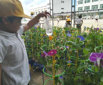 4〜5日前にきれいに咲きそろいました。猛暑日に迫る暑さなので、子ども達は15分休みにも自分のあさがおに水をやりに来ています。