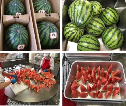 今日は年に1回のすいかがつきました。大きな丸いすいかを64等分に切っています。