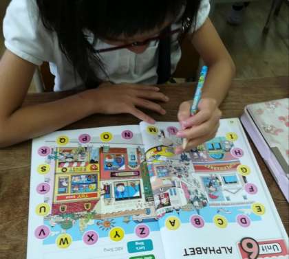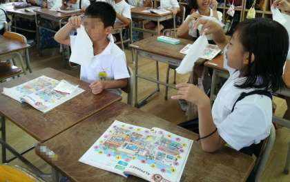 ビデオを見ながらアルファベットの発音練習をしました。バイラ先生がBとPの発音の違いを説明するのに、ティッシュペーパーを用います。すると、Pと発音するとティッシュはふわっとなりますが、Bは発音してもそのままで動きません。Pは発音に振動を伴うからなのですね。みんな楽しそうに発音の違いを試してみていました。