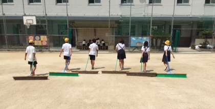 清掃時間、運動委員会が運動場の整地に取り組んでいます。広い運動場がきれいに整地されると、気持ちがいいものです。