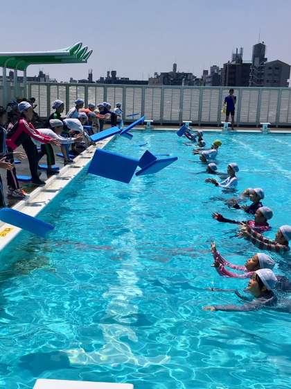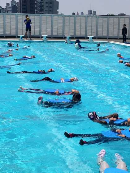 これは、万が一 水難事故に遭遇したときに自分の命を守る大切な学習になります。まずは体を軽く浮かせることや平泳ぎで岸まで泳ぐこと、ビート板やペットボトルなどを使っての浮き方等、しっかりと話を聞き学ぶことができました。