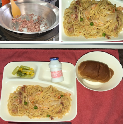 シーフードスパゲッティは個別対応献立(えび)でした。今日は1学期最後の給食でした。2学期の給食始まりは、8月28日からです。メニューは焼きハンバーグ、豆乳コーンスープ、キャベツのカレーソテー、パン、牛乳です。牛乳はびんから紙パックに変更となります。