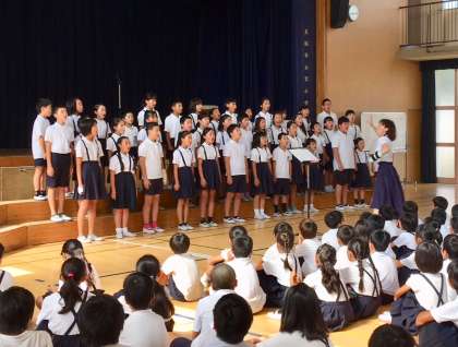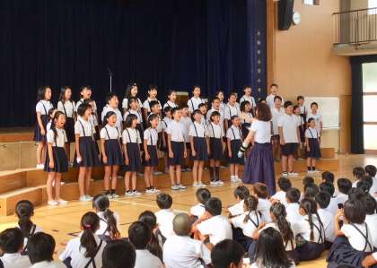 8/9 にNHKホールで開催される NHK全国学校音楽コンクール予選に向けて、合唱クラブの児童が全校児童の前で一次発表をしました。