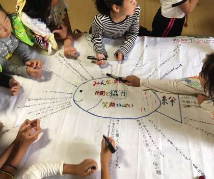 入浴の待ち時間を活用して、白い旗に思い出の寄せ書きをしています。