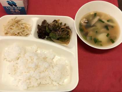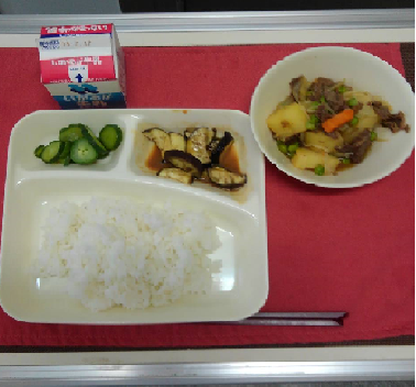 肉じゃが・焼きなすのみそだれかけ・アッサリきゅうり・ご飯・牛乳