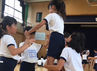 壁を利用したり、グループで補助しあったりしながら、安全面に気を付けて練習しています。