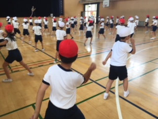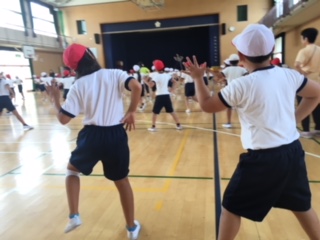3年生の練習の様子です。リズムに合わせて、、手足を元気いっぱい動かしながら踊っています。