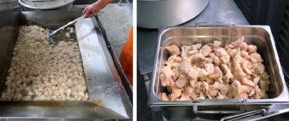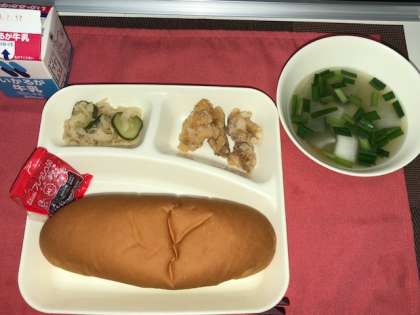 コッペパンにはいちごジャムがつきました。からあげは塩・こしょう・しょうが・にんにくで下味をつけでんぷんをまぶして揚げています。児童にも大人気の1品です。