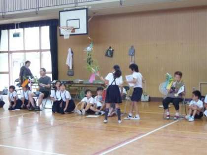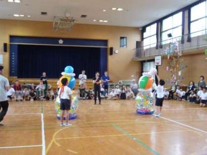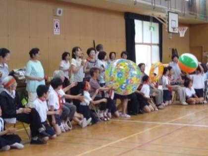 2部は、お年寄りの方たちとゲームをしました。うきわやビーチボールを順番に積み上げていくゲームです。うきわやビーチボールを順番に回して、最後の人が積み上げます。すべるので、難しそうでした。とても、盛り上がりました。