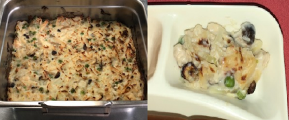 アレルギーサポート月間の為豆乳マカロニグラタンは小麦粉不使用です。米粉を原材料としたマカロニでとろみも上新粉を使用しています。