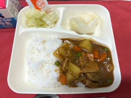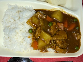 ポークカレーライスのルゥは小麦粉不使用の米粉のカレールゥを使用しています。サラダのドレッシングは卵不使用のマヨネーズ風味のノンエッグドレッシングが1人1袋つきました。