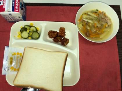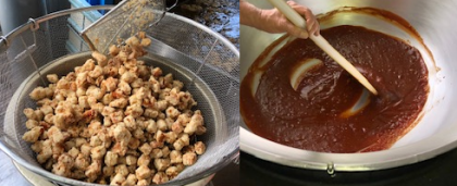 オーロラ煮はでんぷんをつけて揚げたまぐろにケチャップ・砂糖・みそをあわせて煮たオーロラソースをあえた児童にも大人気の1品です。