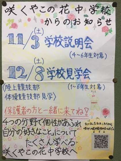 咲くやこの花中学校から学校説明会の案内用ポスターが届きました。今年、咲くやこの花中学校へ進学した卒業生が作成したものです。職員室前の掲示板に掲示しています。