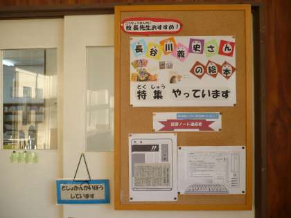図書館では、大阪府出身の絵本作家 長谷川義史さんの著作と挿絵を描かれた作品を集めた「長谷川義史さんの絵本」コーナーを設けました。カラフルで親しみやすい表紙の中身は、おもわず笑っちゃう話ちょっぴりせつなくなる話などさまざまで、子どもたちに大人気。休み時間になると、展示の本はからっぽになります。