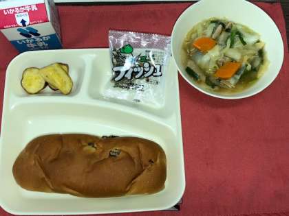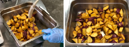 大学いもは砂糖・塩・こい口しょうゆ・水を合わせて煮つめたタレを揚げたさつまいもにからませています。児童にも大好評です。