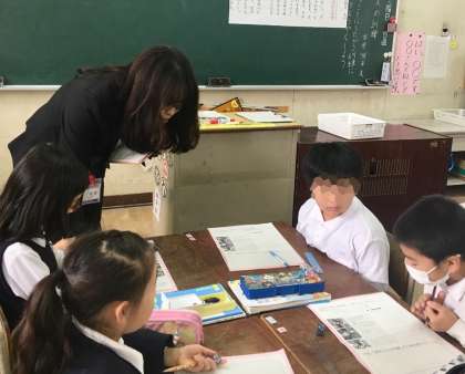 説明文教材『もうどう犬の訓練』で、文章の中から大切な言葉を見つけ、要約する学習です。デジタル教材で前時にもうどう犬の動画を視聴し、本時はペアやグループで学習形態を工夫しての取り組みを進めました。