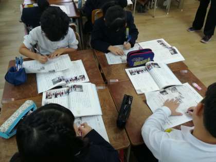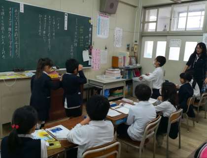 「もうどう犬の訓練」というお話を読んでいます。写真は、教科書の重要な場面を子ども達で実際に演じてみている様子です。題材を通じて、目の不自由な人のことを考える良い機会になりました。