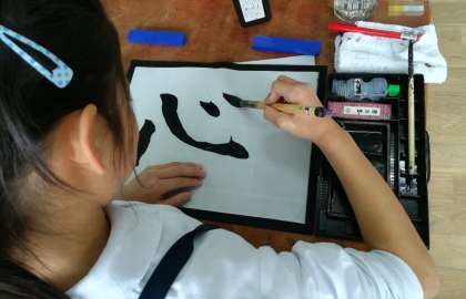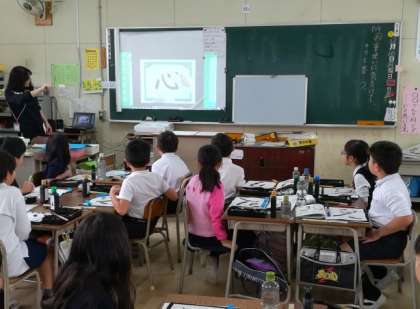12月10日(月)の学習の様子です。「心」という字を書いています。難しい二画目については、「そりをかこう」と題した動画で学習しました。大きくのばして、はねる様子をプロジェクターでスクリーンに映して、筆使いを確認しました。