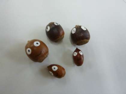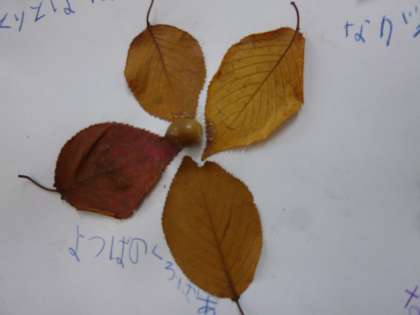 1年生は、遠足や校区たんけんでひろったはっぱやどんぐりであそびました。はっぱをくみあわせて動物やお花をつくったり、どんぐりに目や口を描き入れてお顔にしたり…。
