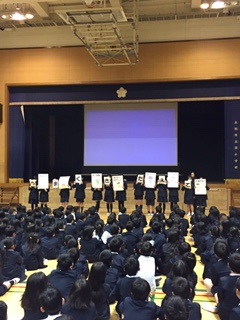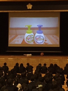 健康委員会の発表です。委員会のの子ども達が、「手洗いうがいの大切さ」について上手に発表していました。来週から「手洗いうがい週間」が始まります。手洗いうがいをしっかりして、かぜやインフルエンザに負けない体を作ってほしいと思います。